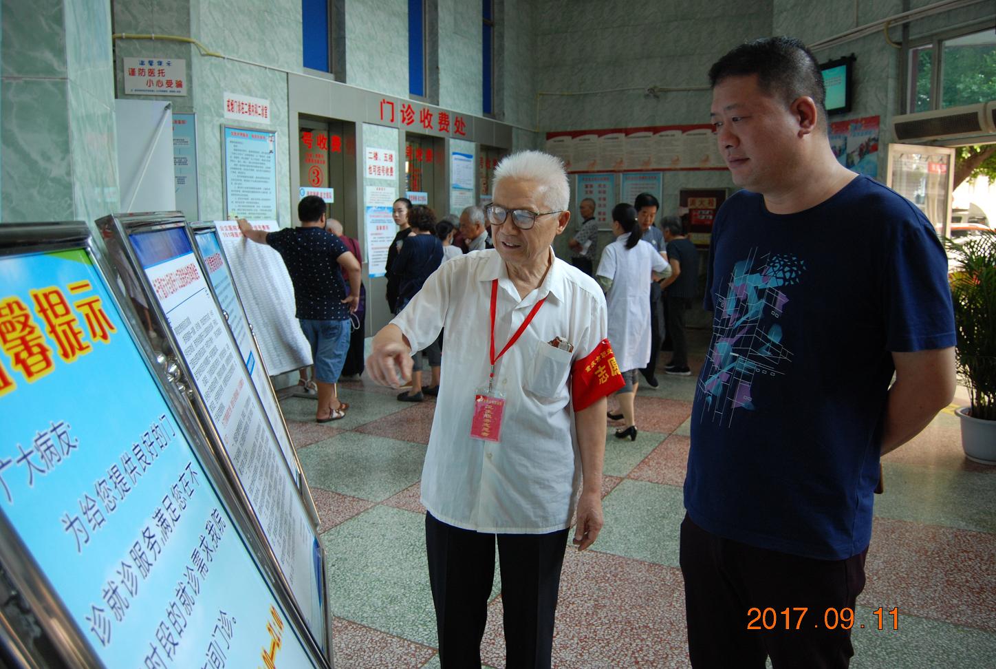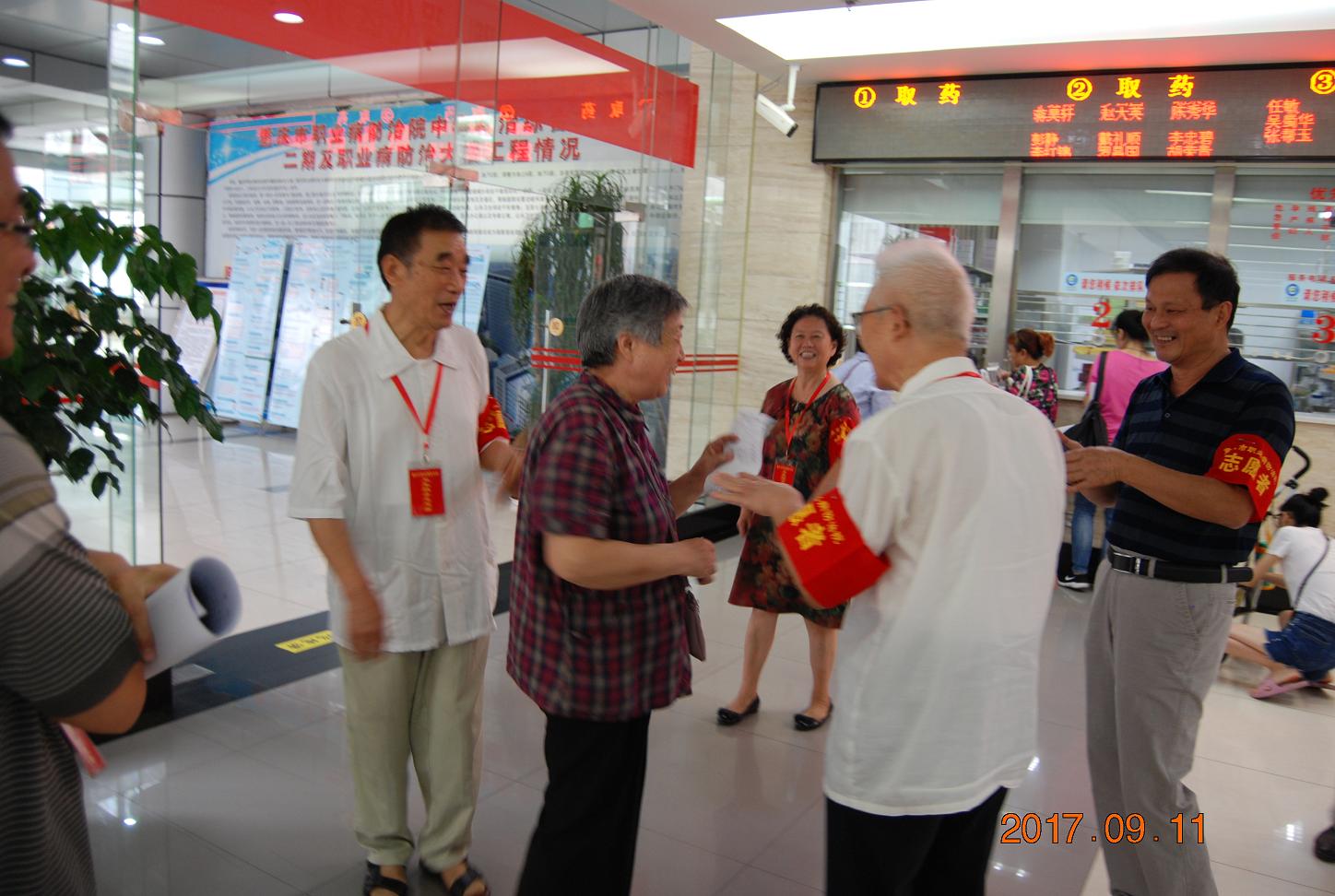 9月11日上午,重庆市第六人民医院门诊大厅、住院部大厅门口,活跃着这样一支特殊的医改志愿者队伍,他们平均年龄71岁,最大的有86岁高龄,年龄最小的也有62岁。头发花白,笑容和蔼的他们,耐心细致的为病人们解读医改政策,成为我院医改志愿者队伍中一道亮丽的风景线。他们是谁?他们就是我院可爱、可敬的离退休老干部。