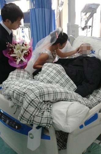 如何能让老人临终时不留遗憾,让其女儿能够释然,胸外科的医生护士们行动起来,准备为这个特殊的家庭在病房举行一场特殊的病房婚礼,从租借婚纱礼服,购买鲜花,布置婚礼场景,婚礼过程,都由胸外科的护士们一手操办。护士们与其主管医生沟通后,选择了一个老人意识比较清醒的时间,为其女儿举行了一场简单而庄严的婚礼,老人满意的望着女儿、女婿,拉着医护人员的手,虽然因使用气管插管不能言语,但老人眼角包含泪花,我们也读懂了老人的心意。其女儿也不停的道谢,感谢医护人员替她弥补了一些遗憾。