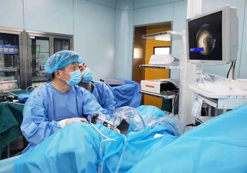 靳文生主任主刀进行经尿道EMS超声碎石术。院方供图