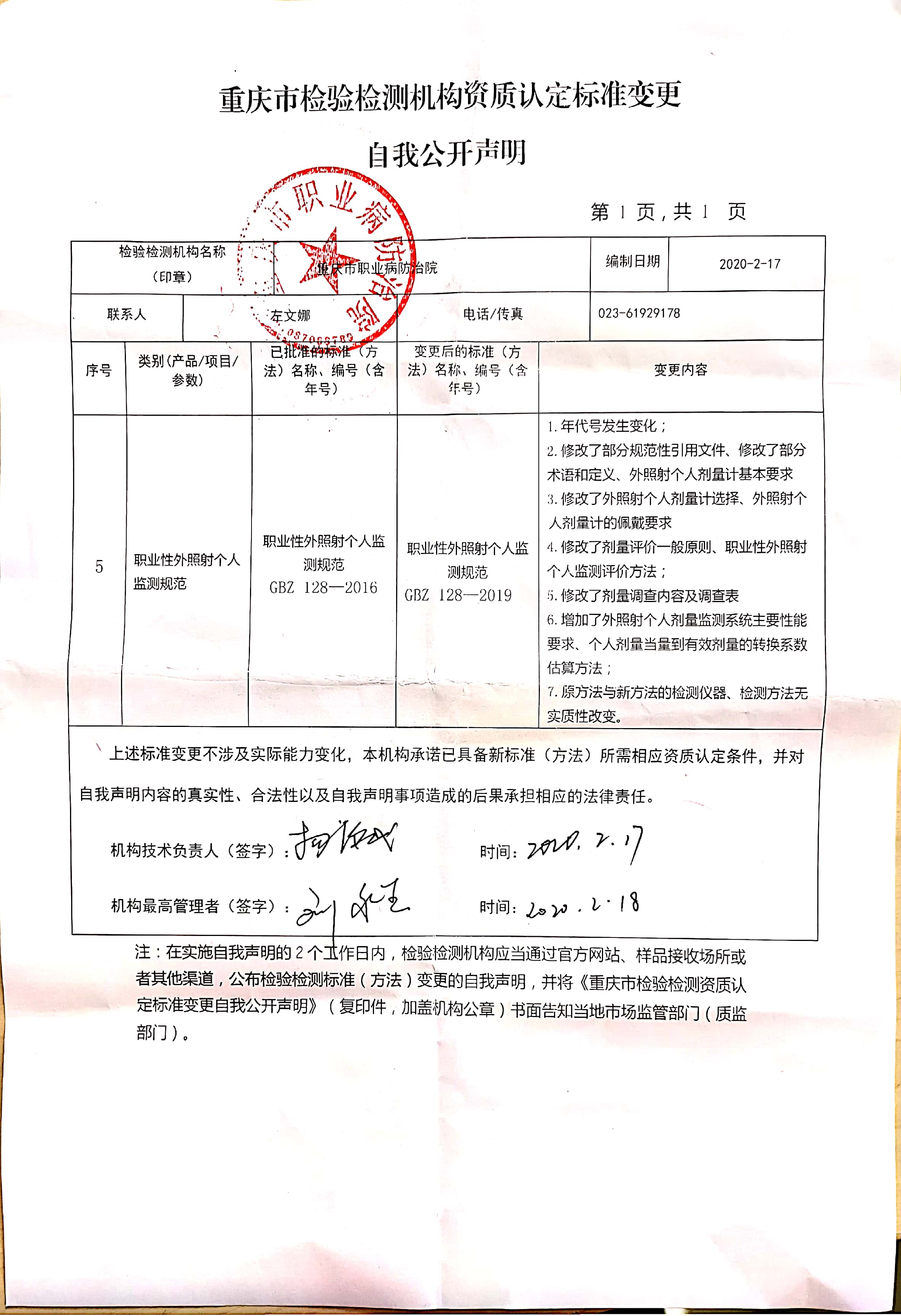 重庆市检验检测机构资质认定标准变更自我公开声明2020.2.20