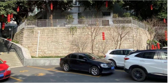浮雕墙位于医技楼背后堡坎处,实景如下图: