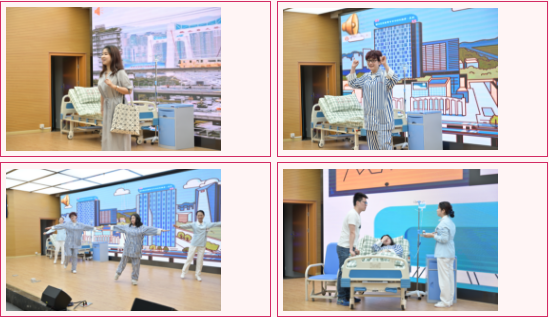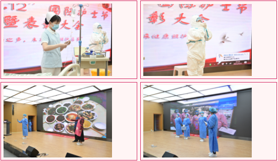 期间,大会还穿插了医护人员共同组织的情景剧和护理技能操作演示等节目。在5月8日护理技能竞赛的一等奖获得者以情景模拟的形式完美演示了穿脱防护服和静脉留置针穿刺技术;《遇见安全遇见爱》充分响应2020年世界患者安全日主题“卫生工作者安全:实现患者安全的首要任务”,把医务工作者日常工作的点点滴滴展示在观众的眼前;《我的2020》将我院医务人员在面临突如其来的新冠“战疫”时的不惧风险投身抗疫前线和现如今的高警示常态化防控状态以戏剧化的形式展现淋漓。标准专业的护理技能演示和绘声绘色的情景剧表演激起全场共鸣,并获得高度赞扬。