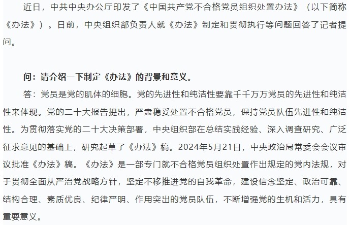 【理论学习】为严肃稳妥处置不合格党员提供制度保证——中央组织部负责人就《中国共产党不合格党员组织...