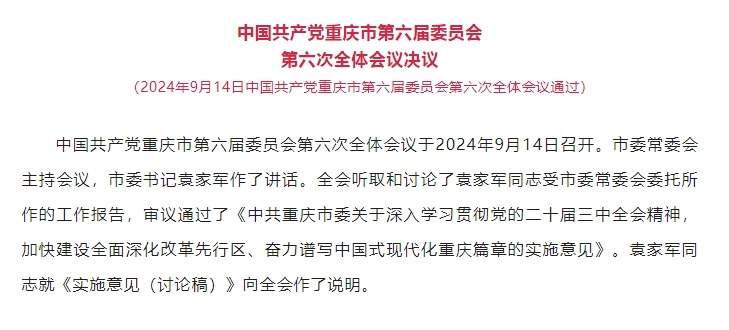 【理论学习】中国共产党重庆市第六届委员会第六次全体会议决议