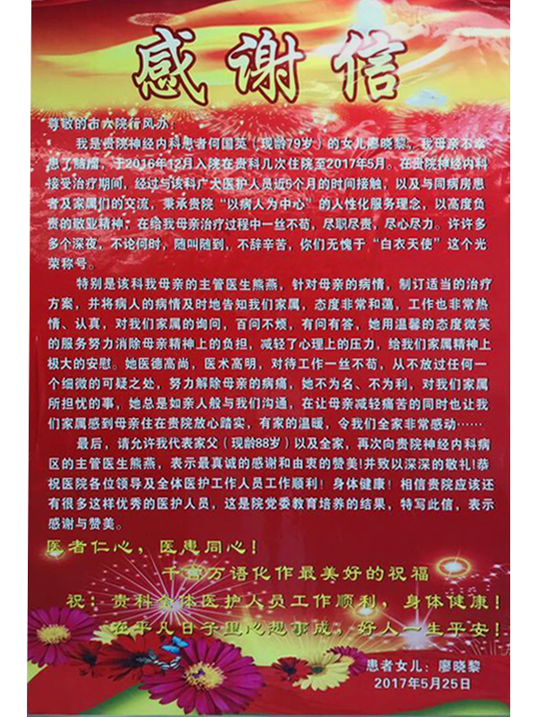 近日,我院神经内科/老年医学科收到一份来自出院患者的特殊礼物——一张红色的印刷纸,上面印着大大的“感谢信”三个字。 “……秉承‘以病人为中心’的人性化服务理念,以高度负责的敬业精...