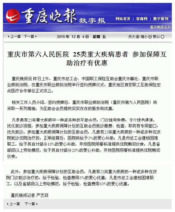 重庆市第六人民医院 25类重大疾病患者 参加保障互助治疗有优惠
