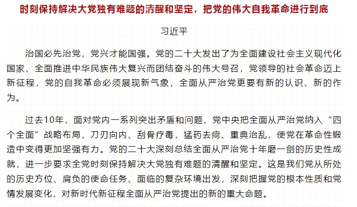 【理论学习】习近平:时刻保持解决大党独有难题的清醒和坚定,把党的伟大自我革命进行到底
