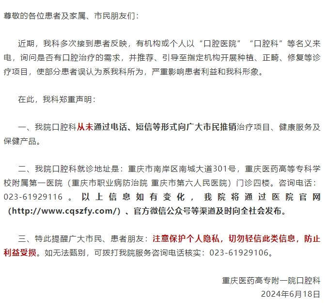 【声明】重庆医药高专一院(市六院 市职防院)口腔科郑重声明