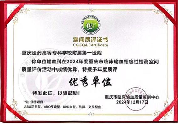 【喜报】祝贺我院荣获“2024年度重庆市临床输血相容性检测室间质量评价优秀单位”称号